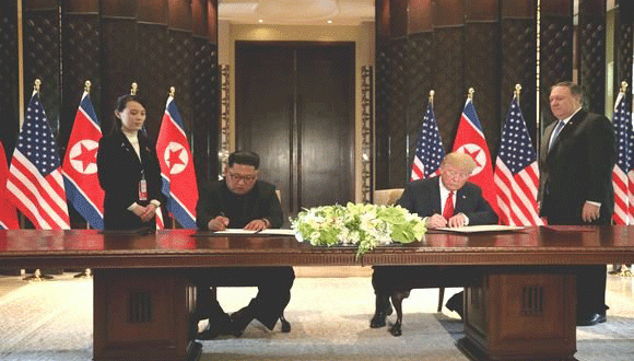 وقع الرئيس الأمريكي, دونالد ترامب, والزعيم الكوري الشمالي, كيم جونغ أون, يوم الثلاثاء, على وثيقة وصفت ب “الشاملة” تضمنت تعهدا كوريا بنزع الأسلحة النووية مقابل حماية أمريكية لمصالح وأمن بيونغ يانغ, في ختام قمتهما في سنغافورة, التي بدأت بمصافحة تاريخية هي الأولى من نوعها بين رئيس أمريكي وزعيم كوري شمالي.