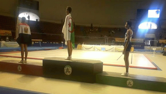 والميدالية الذهبية الجزائرية في الجمباز الفني ( العمود) من انجاز ، صوفيا ناير ، عقب فوزها على المصريتين ، ابو الحسن جانا وسلمى مليج .