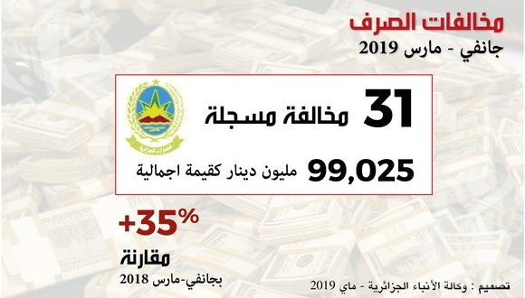 تم تسجيل 31 مخالفة تتعلق بالصرف بقيمة اجمالية بلغت 025ر99 مليون دج (قرابة 834.783 دولار) خلال الثلاثي الأول من 2019، حسبما علم من المديرية العامة للجمارك.