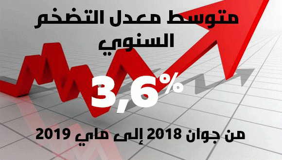 و يمثل تطور أسعار الاستهلاك على أساس سنوي الى غاية مايو 2019 الذي يمثل متوسط معدل التضخم السنوي المحسوب خلال ال12 شهرا الممتدة من يونيو 2018 الى مايو 2019 مقارنة بالسنة الممتدة من أبريل 2016 الى مارس 2017.