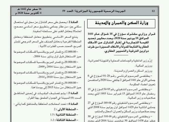 -الفئة الأولى سعر المتر المربع: 12000 دج تخص السكنات الموزعة قبل 2004