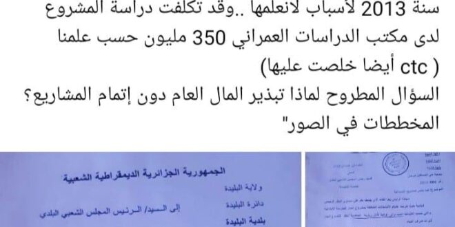 هذا وأوضحت البلدية أن المشروع لم يجمد بل تم تأجيله الى غاية تسوية العقار من طرف الورثة بالحصول على الدفتر العقاري والذي لم يتحصلوا عليه إلى يومنا هذا.