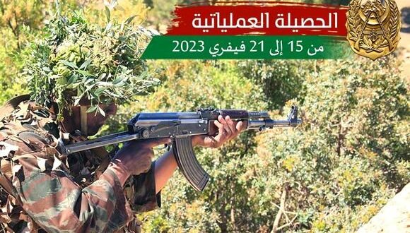 ونفذت وحدات ومفارز للجيش الوطني الشعبي، خلال الفترة من 15 إلى 21 فيفري 2023. عديد العمليات التي أسفرت عن نتائج نوعية، تعكس مدى الاحترافية العالية واليقظة والاستعداد الدائمين لقواتنا المسلحة في كامل التراب الوطني.
